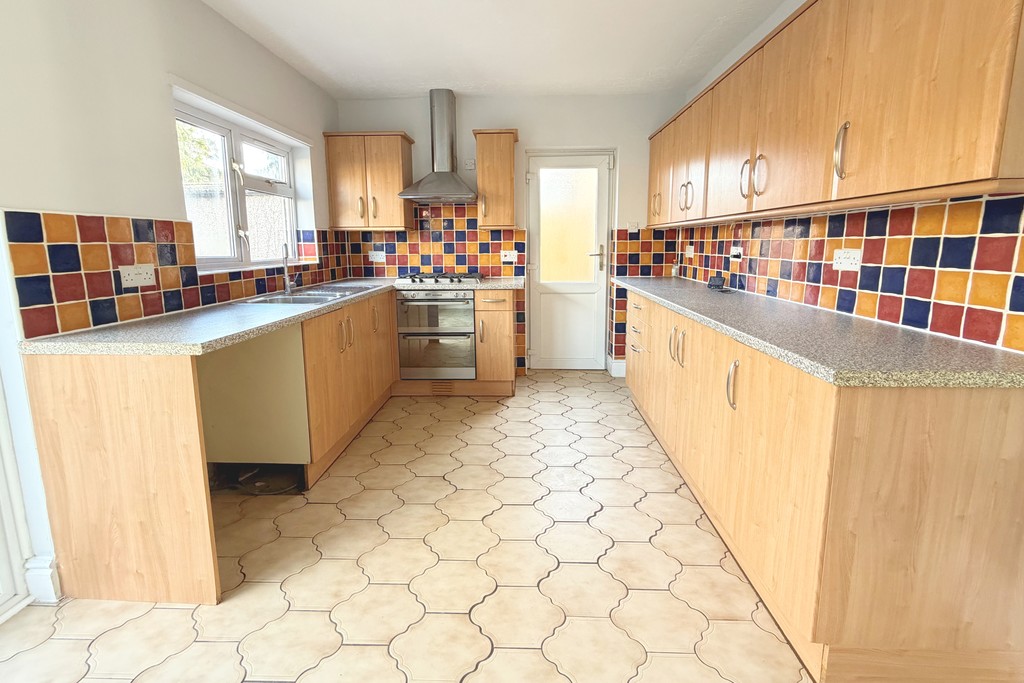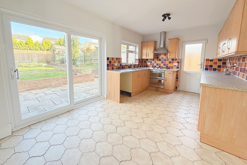 KITCHEN/BREAKFAST ROOM 16' 9" x 9' 10" (5.11m x 3m) A range of light wood effect eye and base level units surmounted by contrasting roll edge worksurfaces. Inset stainless steel 1.5 bowl sink and drainer with mixer tap over. Tiling to splashback areas. Built-in stainless steel double electric oven, five ring gas hob and chimney extractor hood. Space and plumbing for a washing machine or dishwasher. Space for further undercounter appliance. Tiled floor. Double panel radiator. UPVC double glazed window to the rear aspect. Part obscure double glazed UPVC door to the side aspect and UPVC double glazed sliding patio doors to the rear garden.