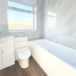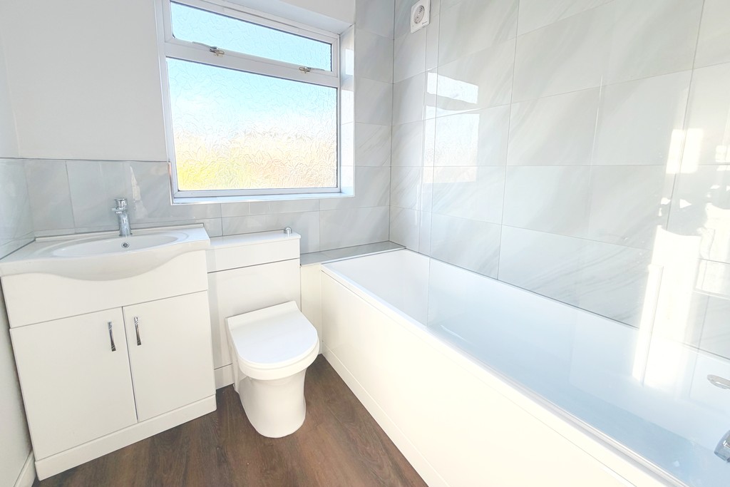 BATHROOM 6' 4" x 6' 1" (1.93m x 1.85m) White suite comprising: panelled bath with thermostatic shower over, vanity unit with low-level toilet and inset wash handbasin. Fully tiled walls. Wood effect laminate floor. Electric shaver socket. Extractor fan. Double panel radiator. Obscure UPVC double glazed window to the rear aspect. Measurement: 6 foot 4 x 6' one.