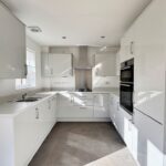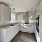 To the rear of the property lies a stunning open-plan kitchen/dining room, finished in a contemporary style with sleek cabinetry, integrated appliances, and ample space for family dining. Elegant French doors open directly onto the landscaped rear garden, seamlessly blending indoor and outdoor living and creating an ideal space for entertaining during the warmer months.
