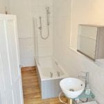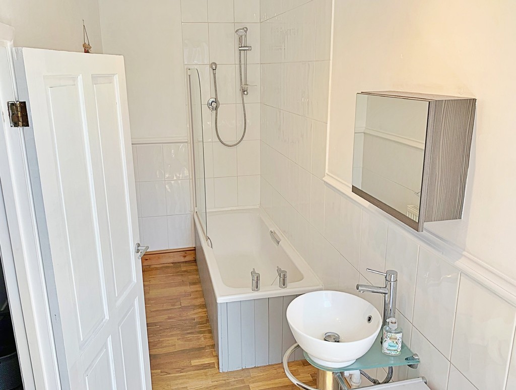 BATHROOM 14' 2" x 4' 8" (4.32m x 1.42m) Obscure uPVC double glazed window to the rear. Wall mounted radiator. Panelled bath with shower over and full height tiling. Low flush WC. Contemporary pedestal wash hand basin. Half height tiling to the rest of the walls.