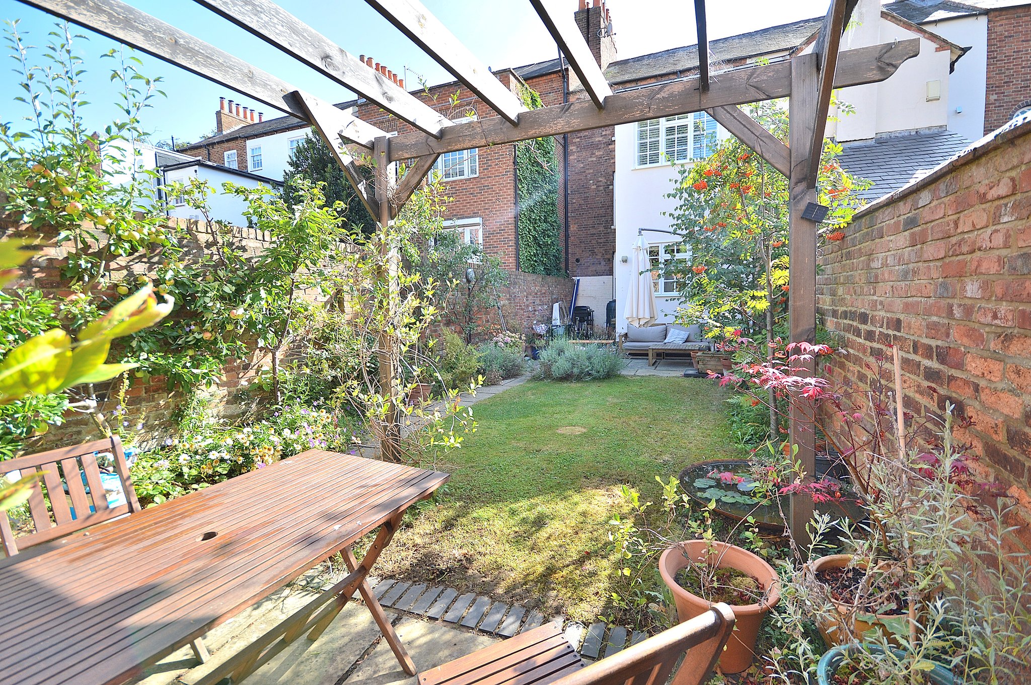 Patio leading to lawn with boarders housing array of different fruit trees including: Cherry trees, apple trees, plum and pear trees. Door leading into the double garage.