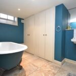 Two piece suite comprising: Pedestal wash hand basin. Freestanding roll top claw foot bath. Large storage cupboard. Window to the rear aspect.