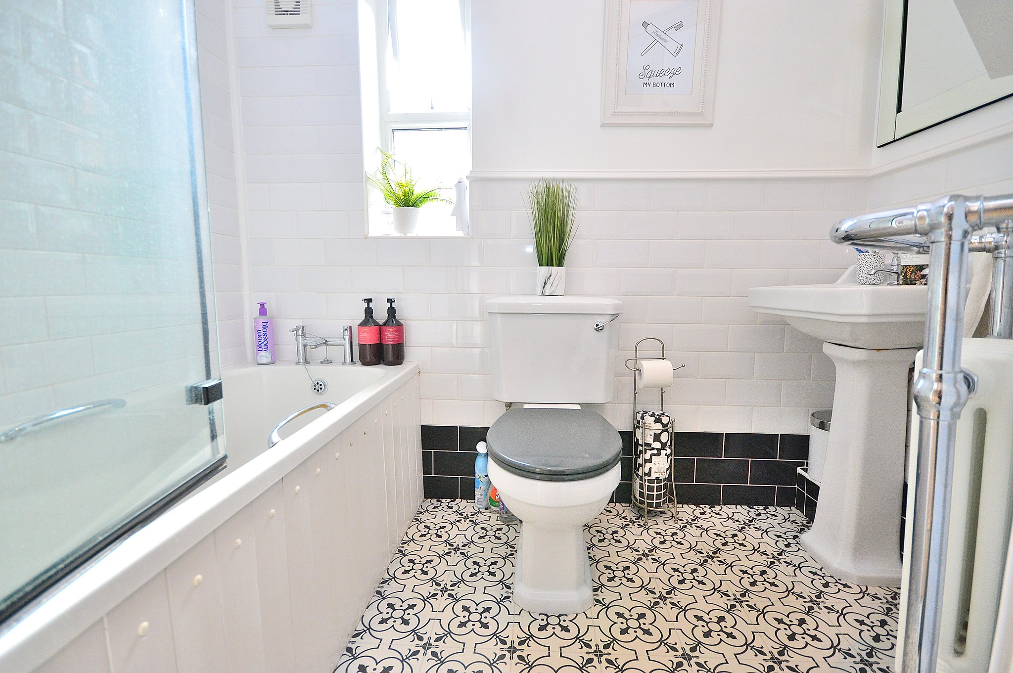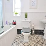 Three piece suite comprising: Low flush Wc. Wall mounted sink. Enclosed shower cubicle with electric shower.