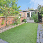 Enclosed rear garden with a block paved patio and pathway leading to the double garage. Artificial lawn with a mature flower and shrub boarder.