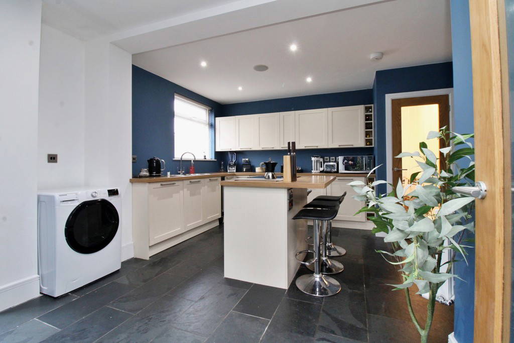 The ground floor begins with a welcoming entrance hall, leading to a bright and spacious living room featuring a bay window that floods the space with natural light. The real heart of this home is the impressive open-plan kitchen and dining area, which has been refitted with a modern range of integrated appliances and a central island that serves as both a social and practical hub. A striking feature of this space is the dual-aspect log burner, perfectly positioned to provide warmth and ambience to both the kitchen and the adjoining sitting room, where French doors open out to the rear garden. Both reception areas are equipped with wall-mounted TV points, offering flexibility and modern convenience.