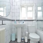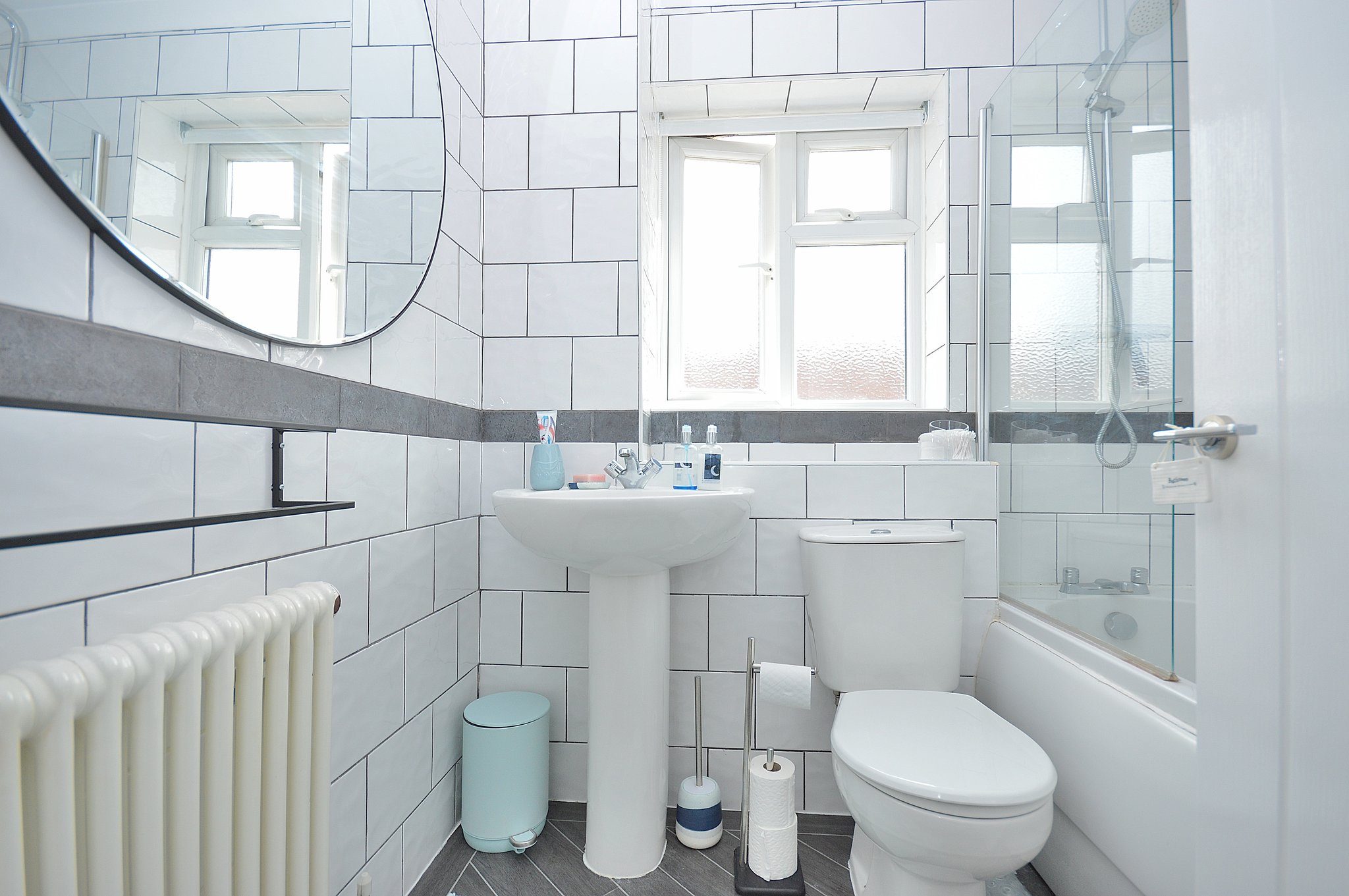 Three piece suite comprising: Low flush Wc. Pedestal wash hand basin. Panelled bath with shower over. Fully tiled. Radiator. Obscured double glazed window to the side aspect.