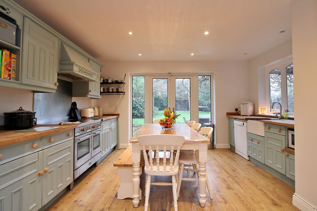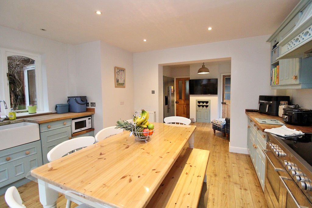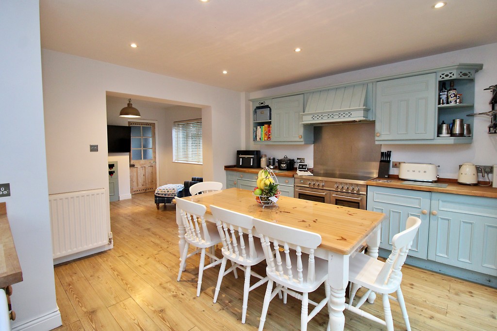 The kitchen/breakfast room is light and airy, fitted with a traditional Belfast sink and a double range oven, and offers ample space for casual dining. A door leads through to the utility room, which houses the central heating boiler and provides space and plumbing for additional appliances.