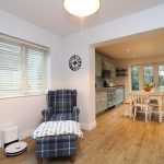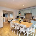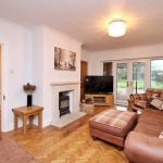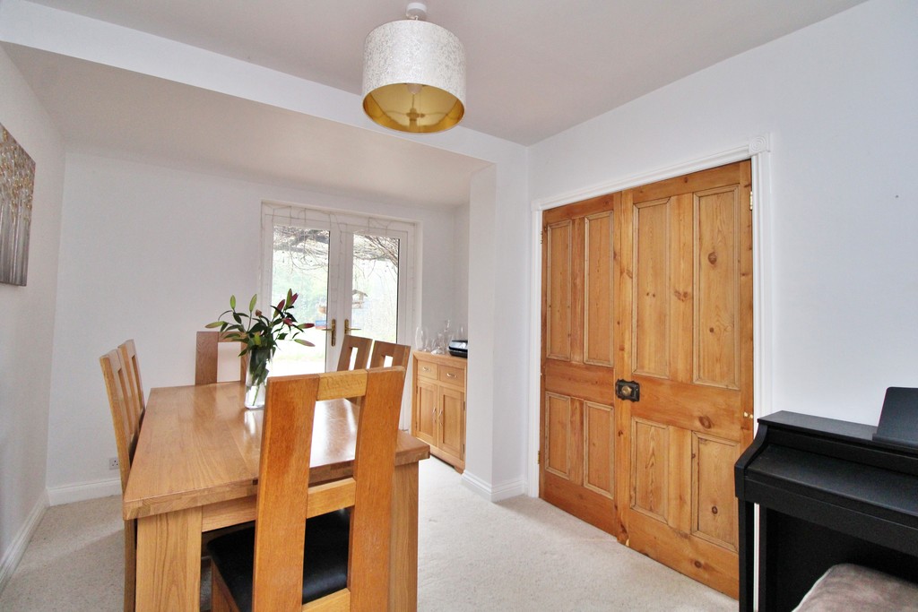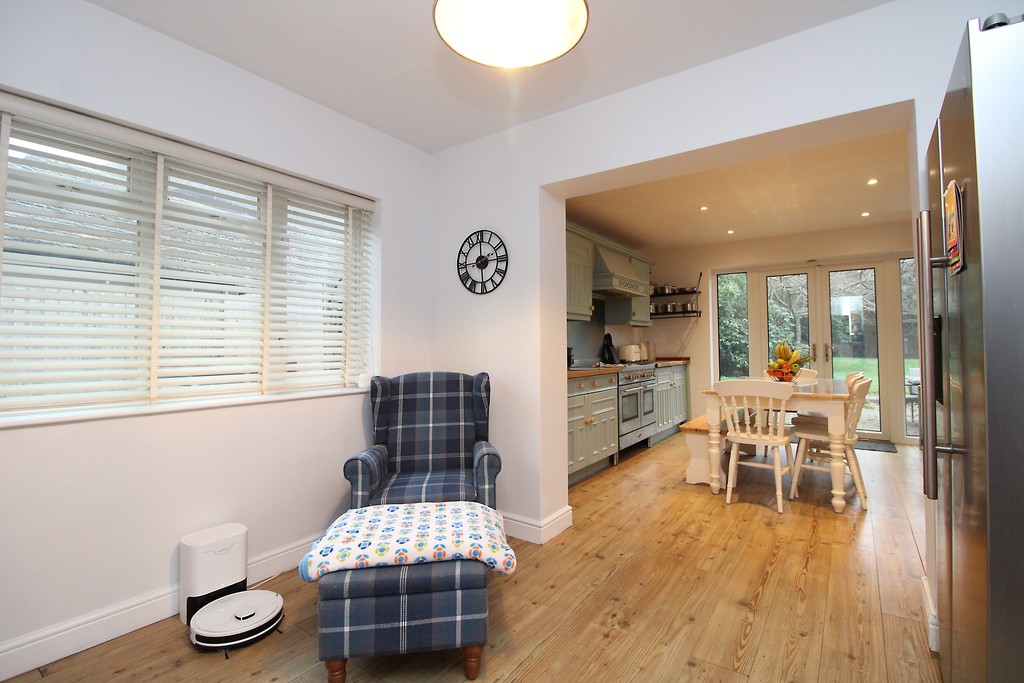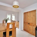 The parquet flooring continues into the sitting room, a bright and inviting space with French doors opening directly onto the rear garden, creating an excellent connection between indoor and outdoor living. Double doors lead from the sitting room into the dining room, which also enjoys French doors to the garden and an internal door through to the kitchen/breakfast room, making it ideal for both entertaining and family use.