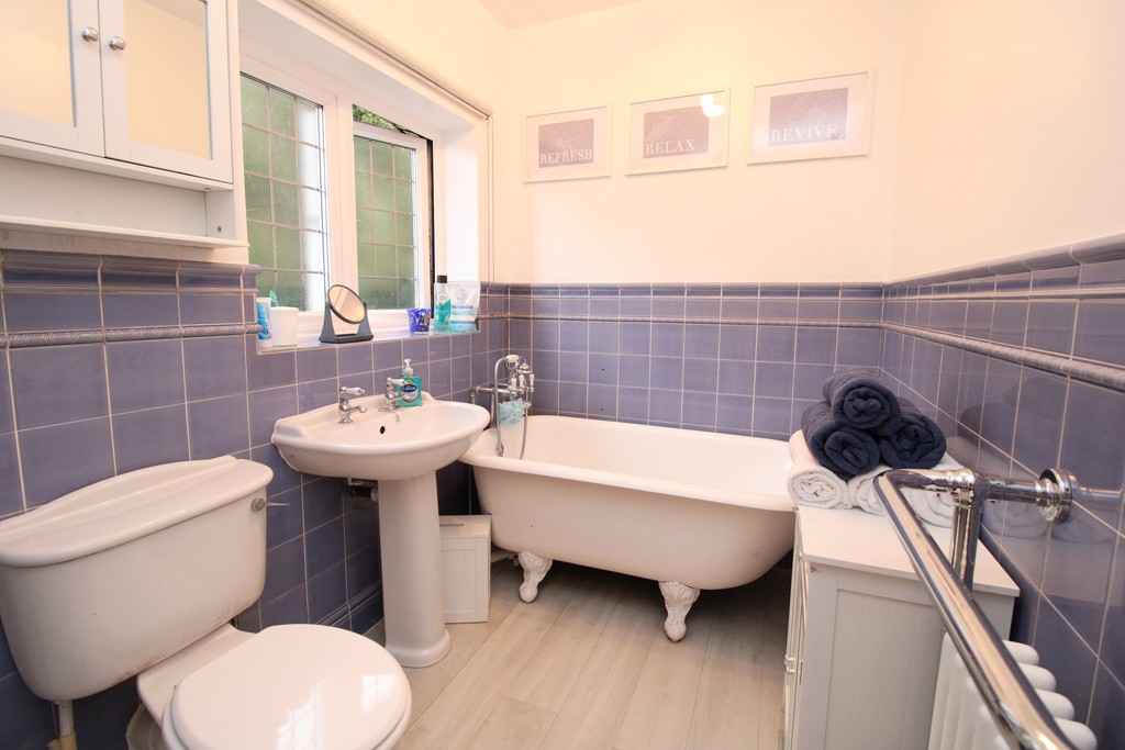 To the first floor, the landing provides access to the loft space and all bedrooms. The principal bedroom benefits from built-in double wardrobes and an additional storage cupboard. Bedroom two enjoys dual-aspect windows with pleasant views over the rear garden, while bedrooms three and four are both well sized, with bedroom three overlooking the side and bedroom four enjoying rear garden views. The family bathroom is well appointed, featuring both a separate shower cubicle and an elegant roll-top bath.