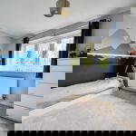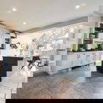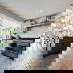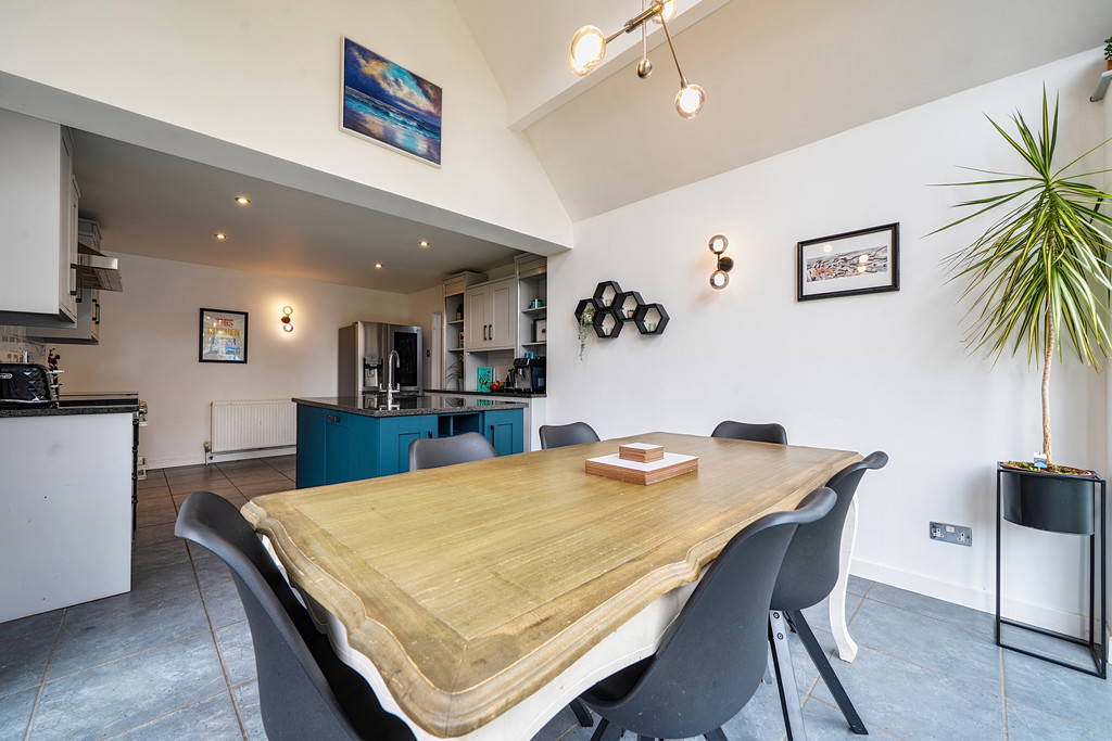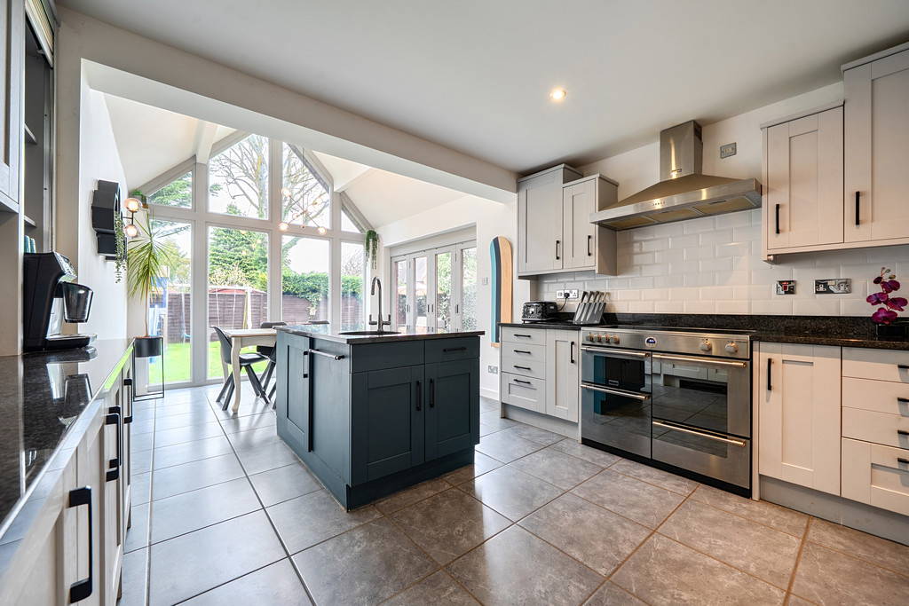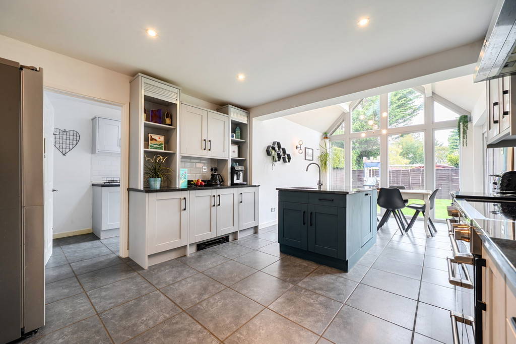 At the heart of the home lies a stunning extended kitchen, thoughtfully designed and refitted to a high specification. It boasts a comprehensive range of contemporary units, a double oven, and a variety of integrated appliances, all centred around a stylish island. A striking A-frame style window provides a wonderful architectural feature, flooding the space with natural light while offering delightful views over the rear garden.