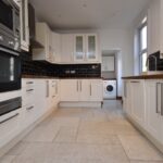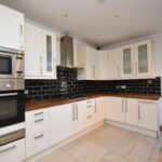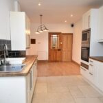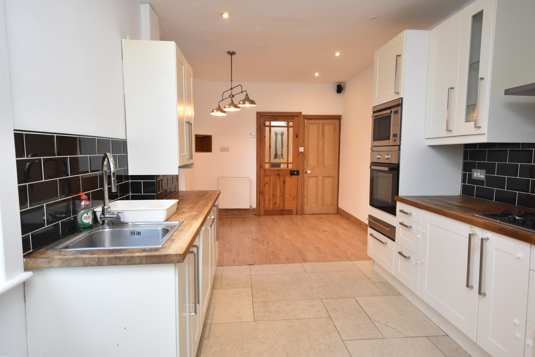 21' 0" x 9' 3" (6.40m x 2.82m) A fitted kitchen comprising a range of base and wall mounted storage units with wooden work surfaces over, complimentary tiling, stainless steel sink unit and drainer, fitted electric oven, five ring gas hob and stainless steel cooker hood over, integrated fridge/freezer, two radiators, two double glazed windows to the side aspect, Tv point, doorway to utility room, door to shower room and further door down to bedroom four.