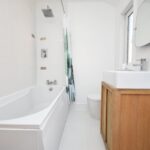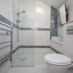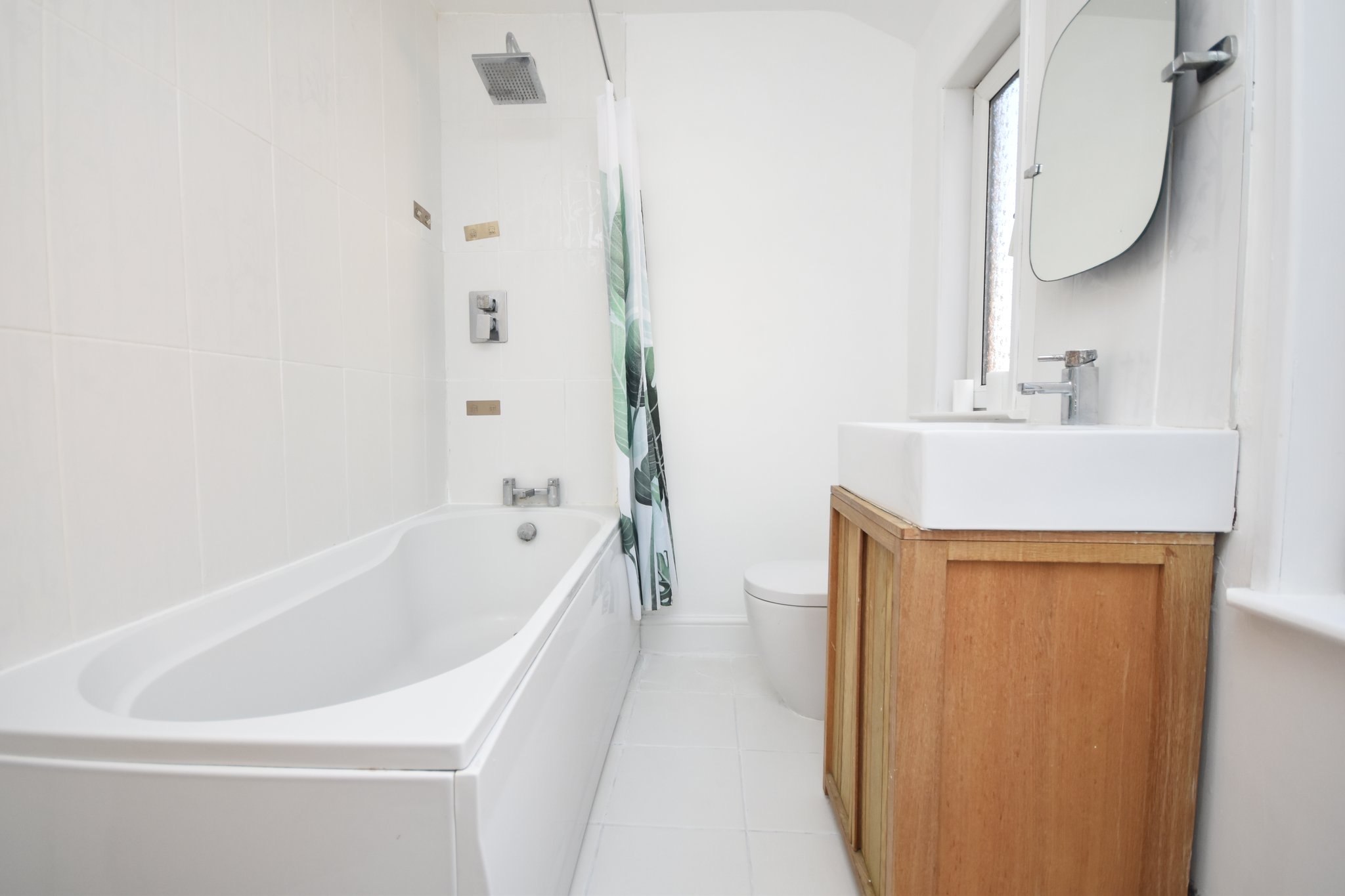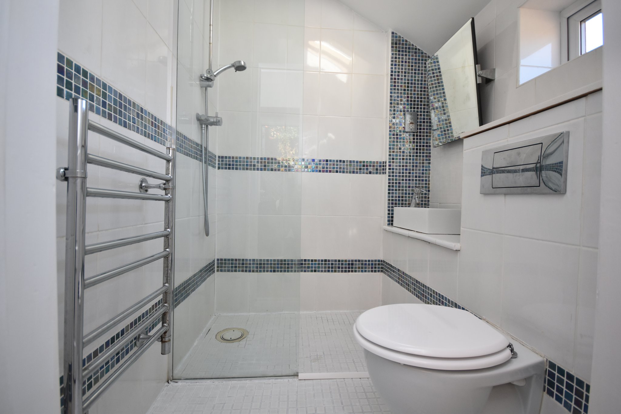 5' 6" x 5' 4" (1.68m x 1.63m) Comprising low flush WC, wash hand basin and shower with glass surround, mosaic style tiling, heated towel rail and double glazed skylight window to the rear aspect.