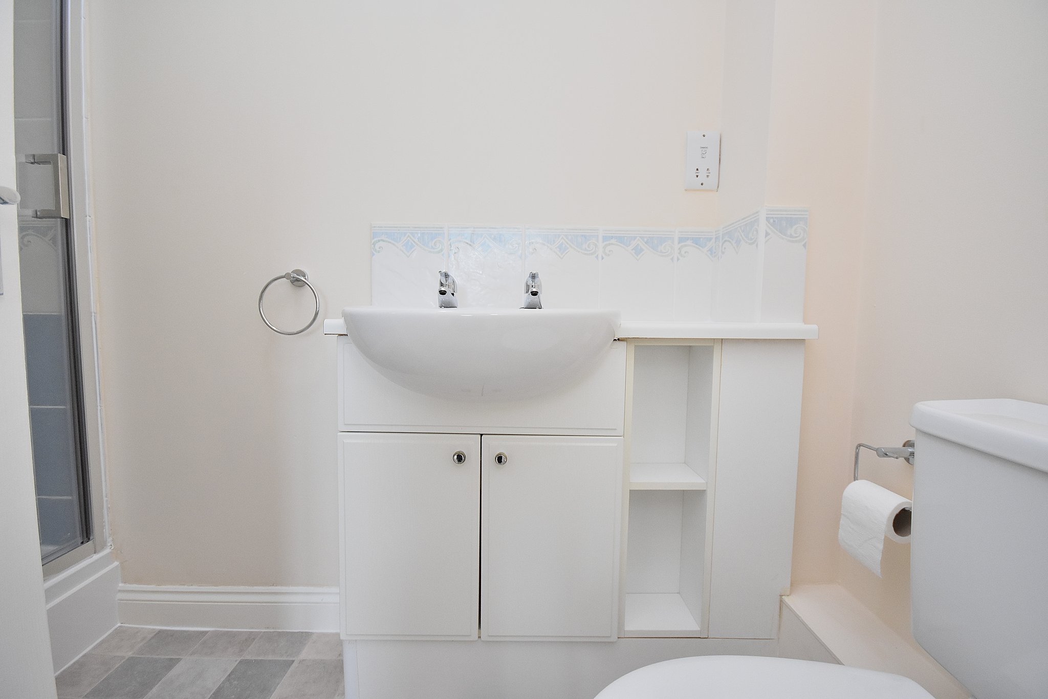 Three piece suite comprising: Low flush Wc. Vanity unit with sink mounted over. Enclosed shower cubicle. Radiator. Tiled to water sensitive areas.