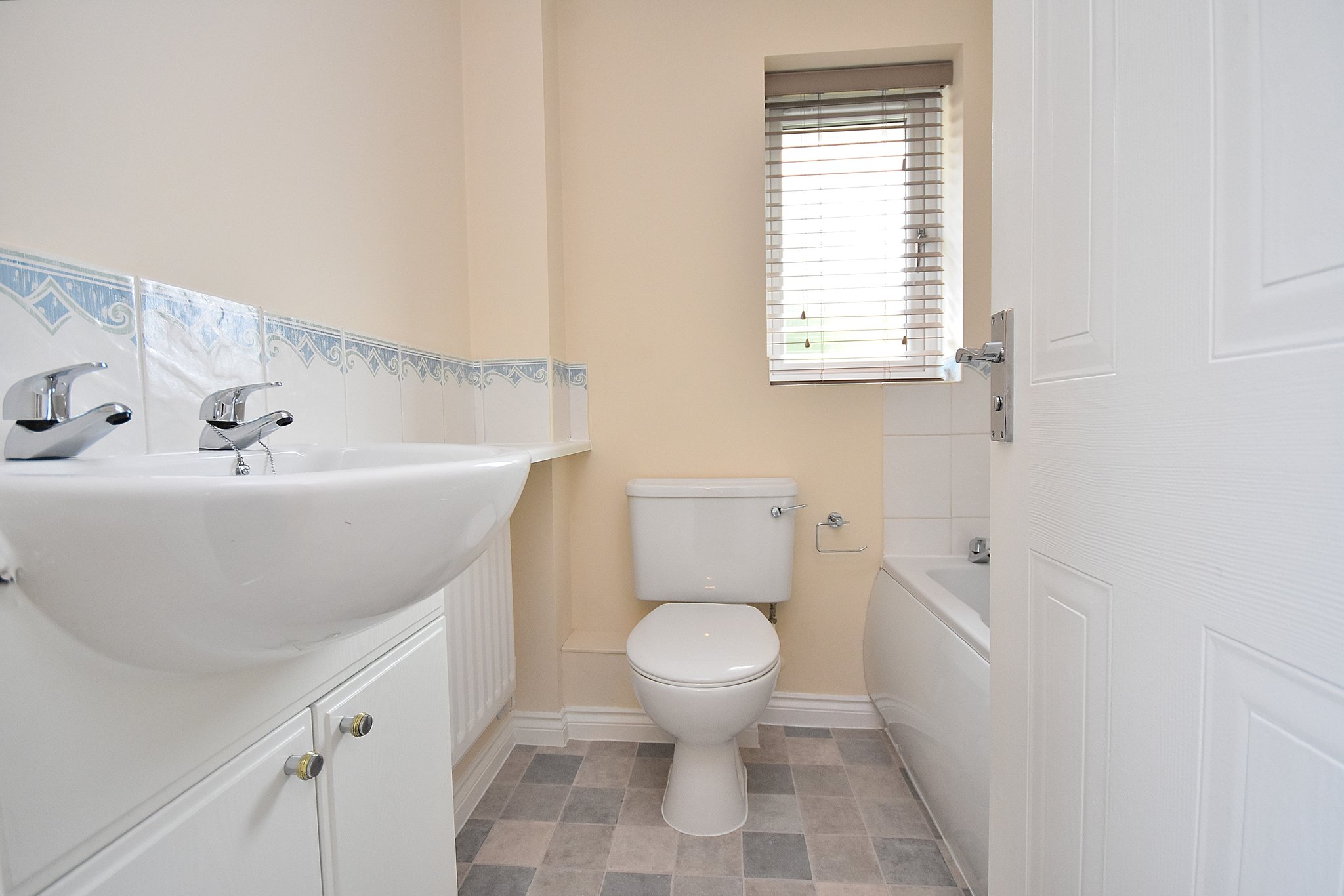 Three piece suite comprising: Low flush Wc. Vanity unit with sink mounted over. Panelled bath with mixer taps over. Radiator. Upvc obscured double glazed window to rear aspect.