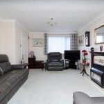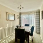 The internal accommodation comprises a welcoming entrance hall leading to the main living areas. The spacious living room features a central focal fireplace and offers a bright and comfortable setting for everyday family life. Adjacent is the dining room, which enjoys views over the rear garden and benefits from patio doors that open directly onto the outdoor space. The kitchen is fitted with a range of units and appliances and includes a convenient side door providing external access.