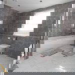EN-SUITE BATHROOM 10' 0" x 10' 0" max (3.05m x 3.05m) White suite comprising: double sink with mixer taps over and vanity unit under, low-level toilet with concealed cistern, panelled bath with mixer tap and double shower enclosure with thermostatic shower. Fully tiled walls and floor. Recessed ceiling spotlights. Ceiling extractor fan. Single panel radiator with thermostat control. Obscure uPVC double glazed sash window to the side aspect.