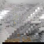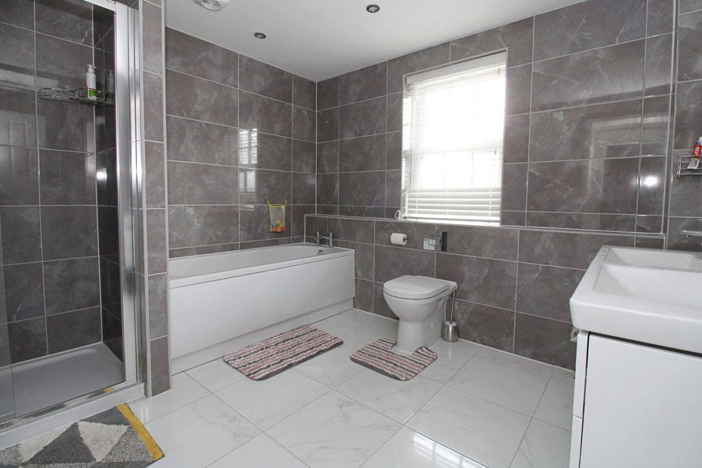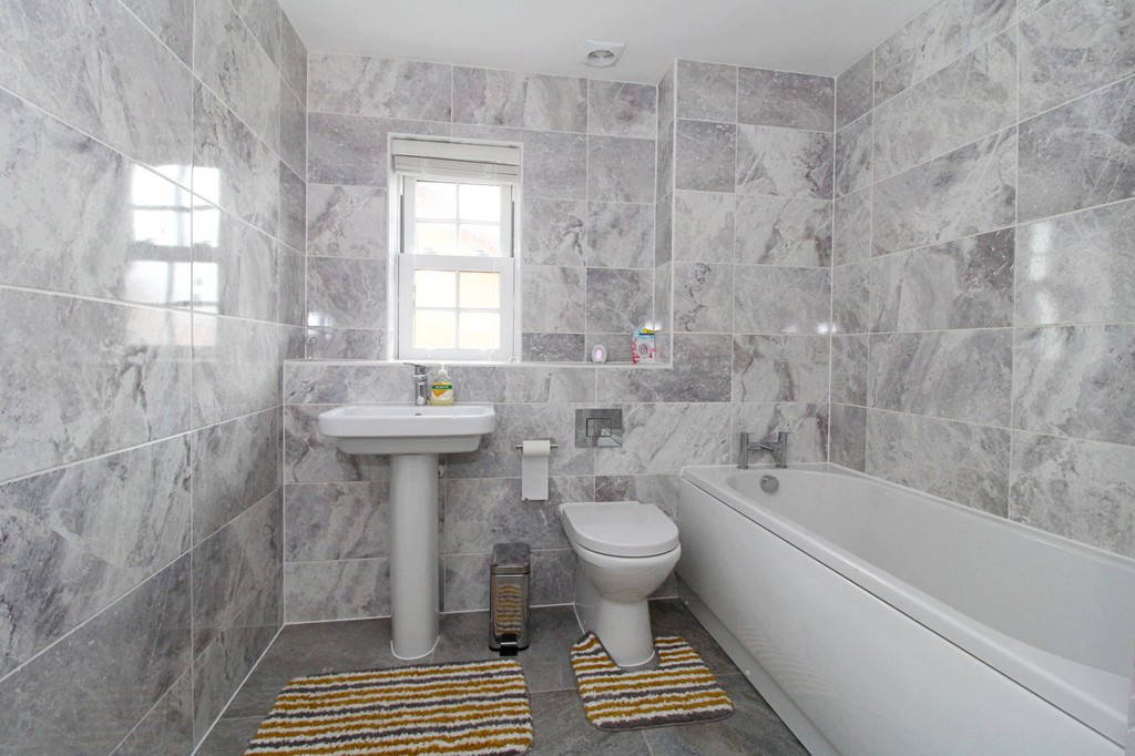 DUAL ACCESS BATHROOM 10' 3" x 7' 4" (3.12m x 2.24m) Accessed from the landing and bedroom three. White suite comprising: pedestal wash hand basin, low-level toilet with concealed cistern and panelled bath with mixer tap. Fully tiled walls and floor. Recessed ceiling spotlights. Ceiling extractor fan. Single panel radiator with thermostat control. Obscure uPVC double glazed sash window to the side aspect.