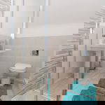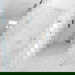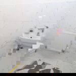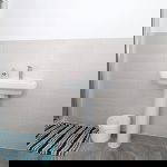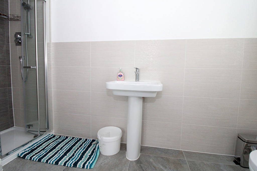 SHOWER ROOM White suite comprising: low-level toilet with concealed cistern, pedestal wash hand basin and fully tiled shower enclosure with thermostatic shower. Part tiled walls. Tiled floor. Recessed ceiling spotlights. Ceiling extractor fan. Single panel radiator with thermostat control.