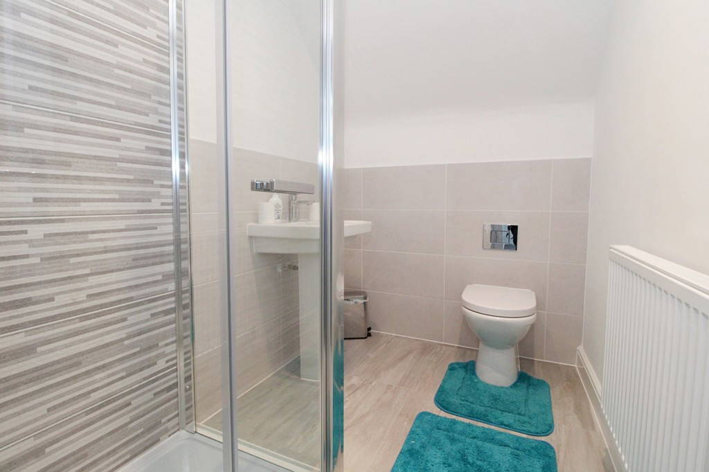 EN-SUITE SHOWER ROOM White suite comprising: low-level close coupled toilet, pedestal wash hand basin and fully tiled shower enclosure with thermostatic shower. Part tiled walls. Recessed ceiling spotlights. Tiled floor. Wall mounted extractor fan. Single panel radiator with thermostat control. Obscure uPVC double glazed sash window to the side aspect.