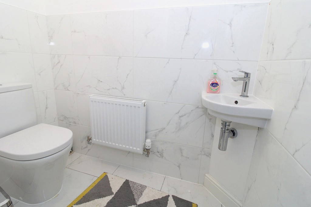 CLOAKROOM Low-level close coupled toilet and wall mounted corner wash hand basin. Tiling to half height. Tiled floor. Ceiling extractor fan. Single panel radiator with thermostat control.