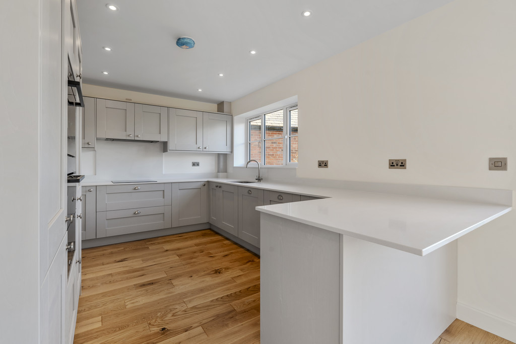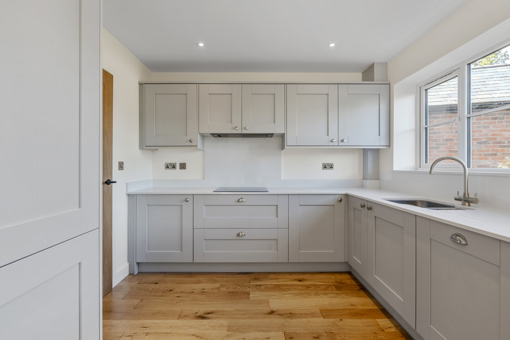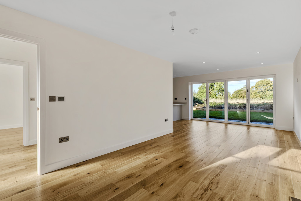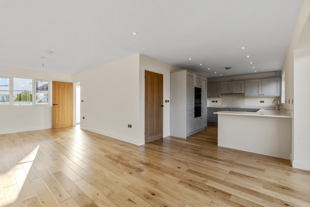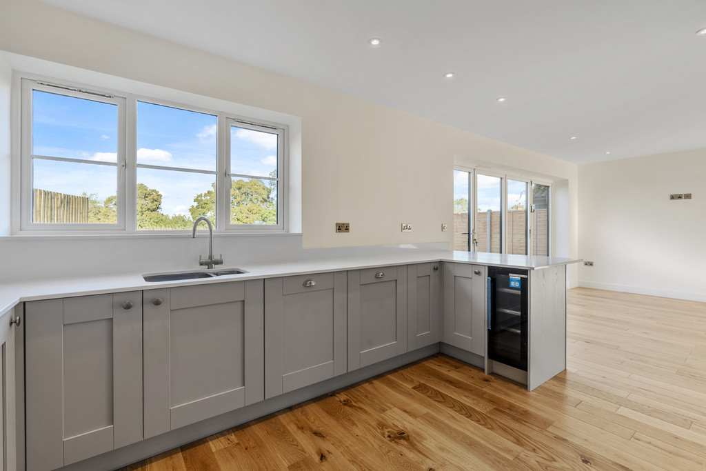 The spacious sitting room, with provision for a wall-mounted television, provides a cosy retreat, while the heart of the home lies within the stunning open-plan living and dining area. Designed with entertaining in mind, this versatile space includes a designated area for a log burner and is bathed in natural light from its carefully planned layout. Adjoining this is the bespoke, high-end kitchen, fitted with elegant quartz work surfaces and a comprehensive range of integrated appliances including a Samsung mirrored double oven, Samsung electric hob, wine cooler, and fridge/freezer. A separate utility room offers additional storage, space for white goods, and direct access to the side courtyard garden. Completing the ground floor is a stylish cloakroom/WC and a dedicated boiler room housing the top-of-the-range Daikin air source heating system, ensuring efficiency and sustainability.