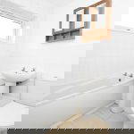 Bathroom White bathroom suite comprising: panelled bath with electric shower over, pedestal wash hand basin and low level toilet. Tiled splashback areas. Tiled floor. uPVC double glazed window to the side aspect.