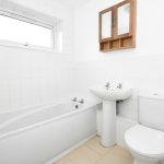 Bathroom White bathroom suite comprising: panelled bath with electric shower over, pedestal wash hand basin and low level toilet. Tiled splashback areas. Tiled floor. uPVC double glazed window to the side aspect.