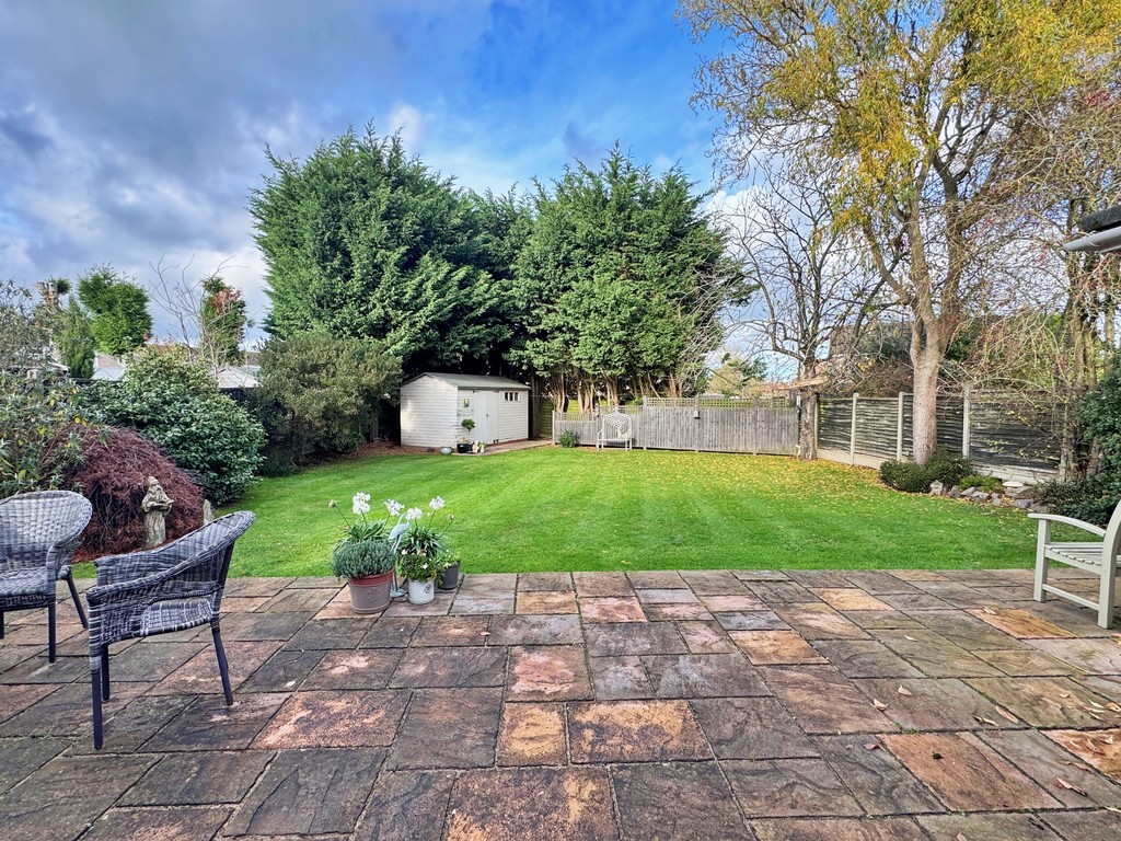 Externally, the property boasts a generously sized rear garden-predominantly laid to lawn and complemented by a paved patio area ideal for outdoor dining and entertaining. A timber shed provides useful additional storage, and side pedestrian access leads to the front. The large driveway offers off-road parking for several vehicles, enhancing convenience.