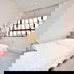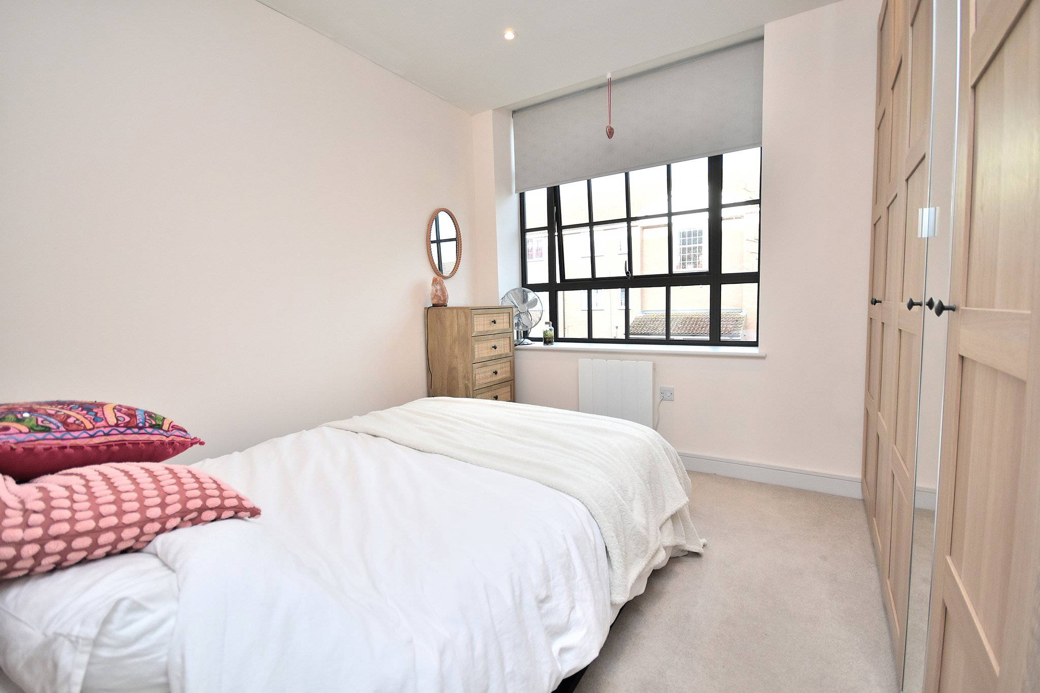 A large picture window lights up the bedroom. Electric Radiator.
