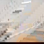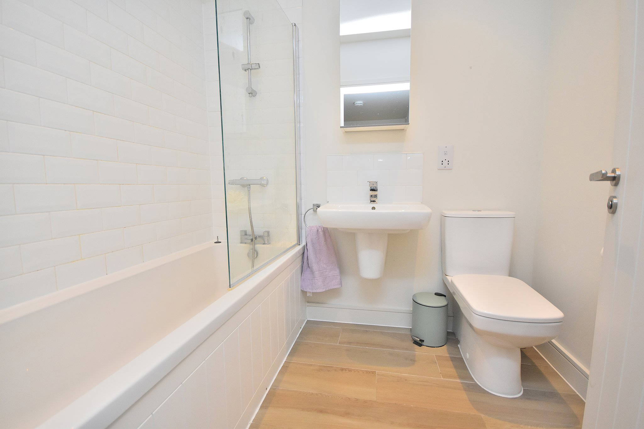 A fitted three piece modern bathroom suite comprising of a panelled bath with Cross water shower fittings, WC and pedestal wash hand basin. Chrome heated towel rail and modern tiling. Under floor heating.