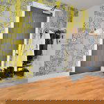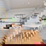A spacious living area boasting two large window with a fitted kitchen area. The kitchen is fitted in a modern and elegant shaker style and features integrated appliances and modern tiling.