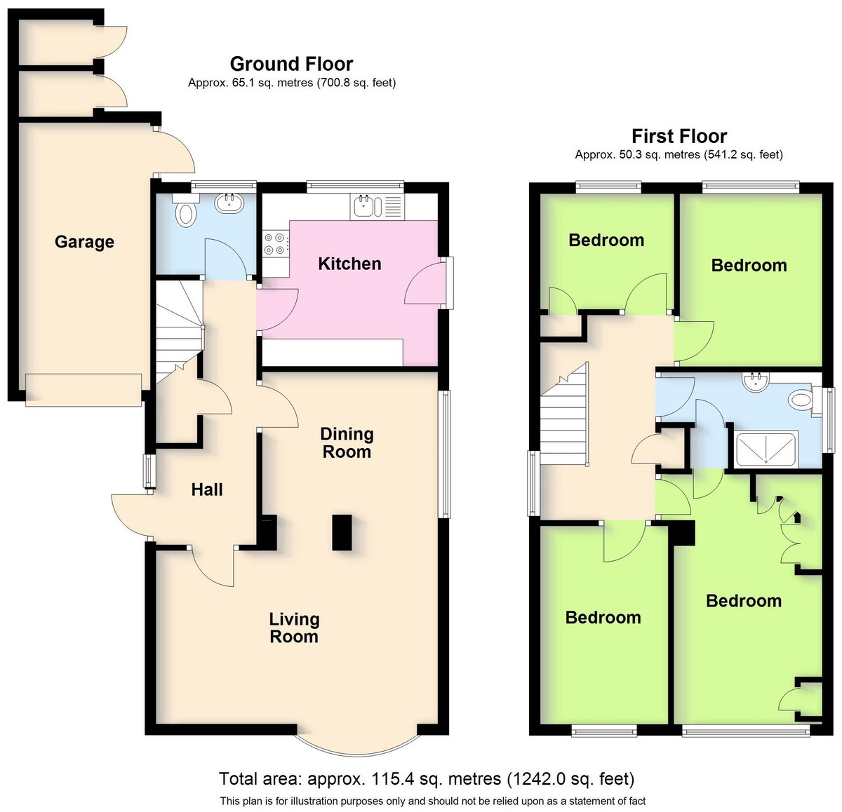 The first floor comprises four well-proportioned bedrooms, each offering comfortable accommodation. The master bedroom is particularly impressive, benefitting from a bespoke range of fitted wardrobes that provide ample storage. The bedrooms are served by a refitted shower room.