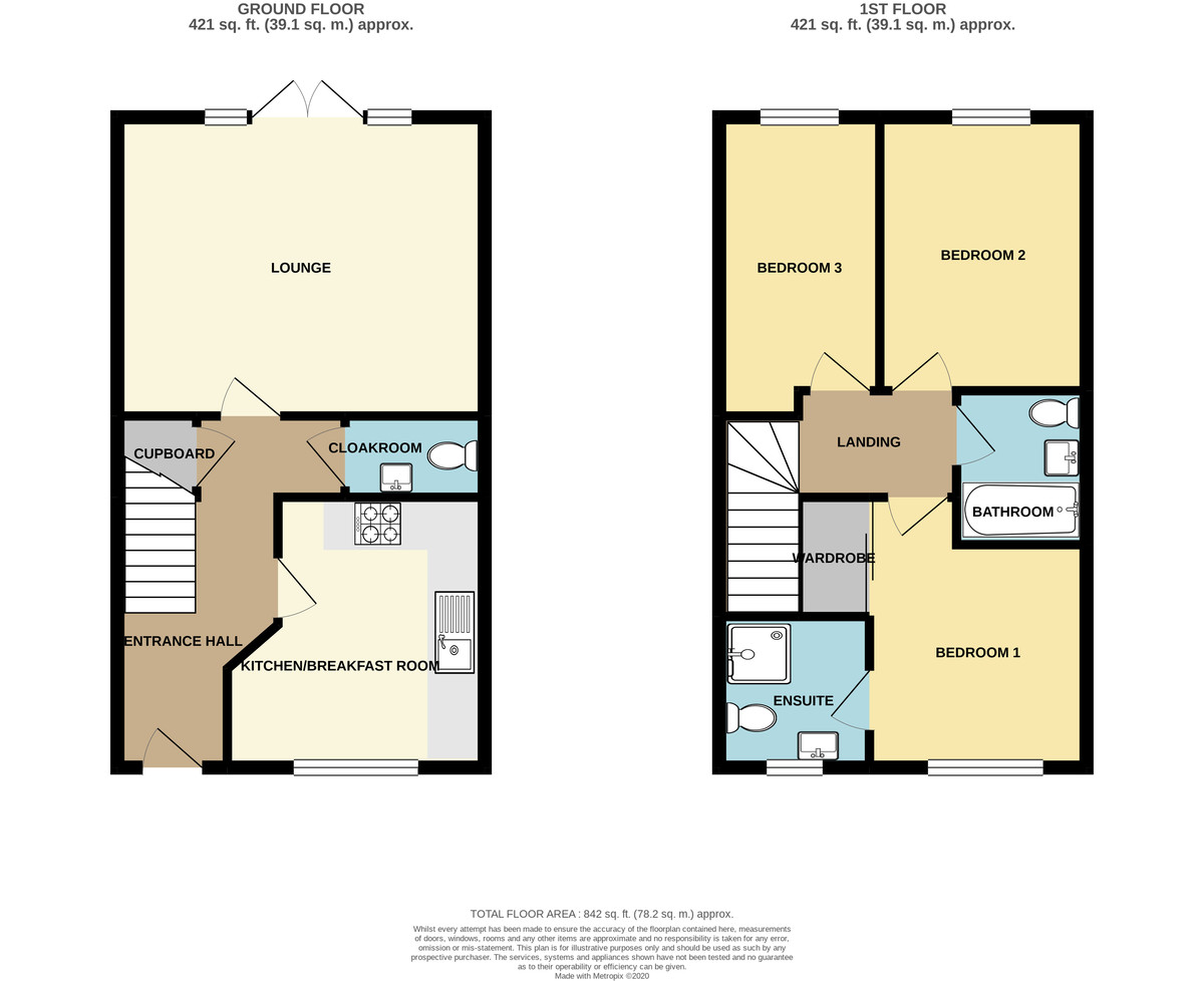 The property features an entrance hall, kitchen/diner, lounge with doors to the garden, guest WC, three bedrooms with en-suite to master, and a family bathroom.