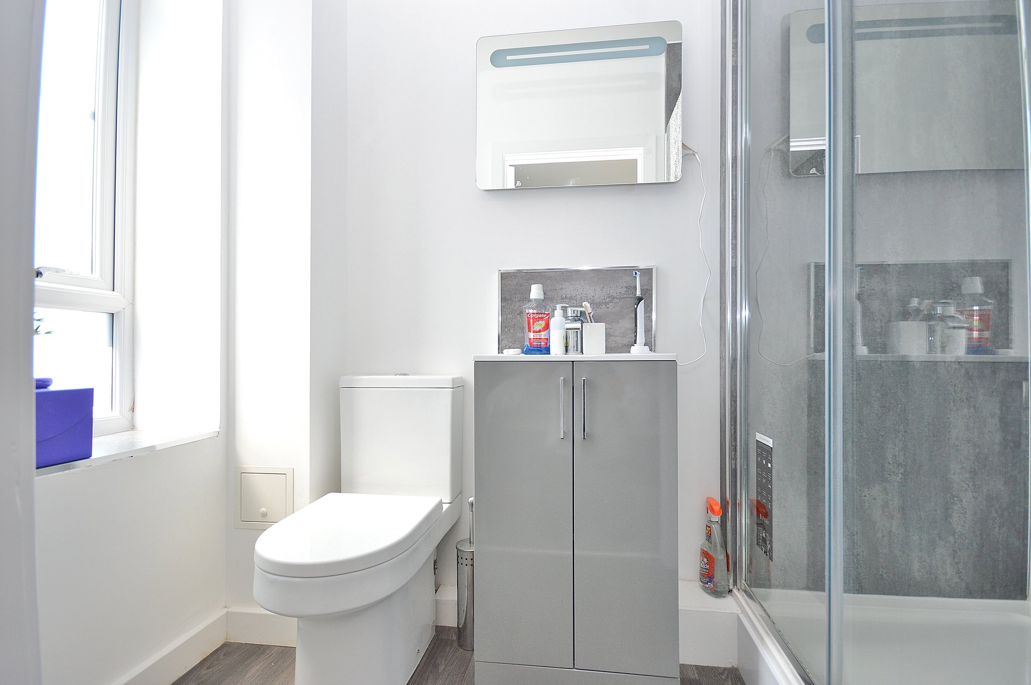 8' 0" x 4' 0" (2.44m x 1.22m) Fitted three piece suite comprising of a low level WC, vanity unit with wash hand basin and shower enclosure. Obscure upvc double glazed window to the front aspect. Heated chrome towel rail.