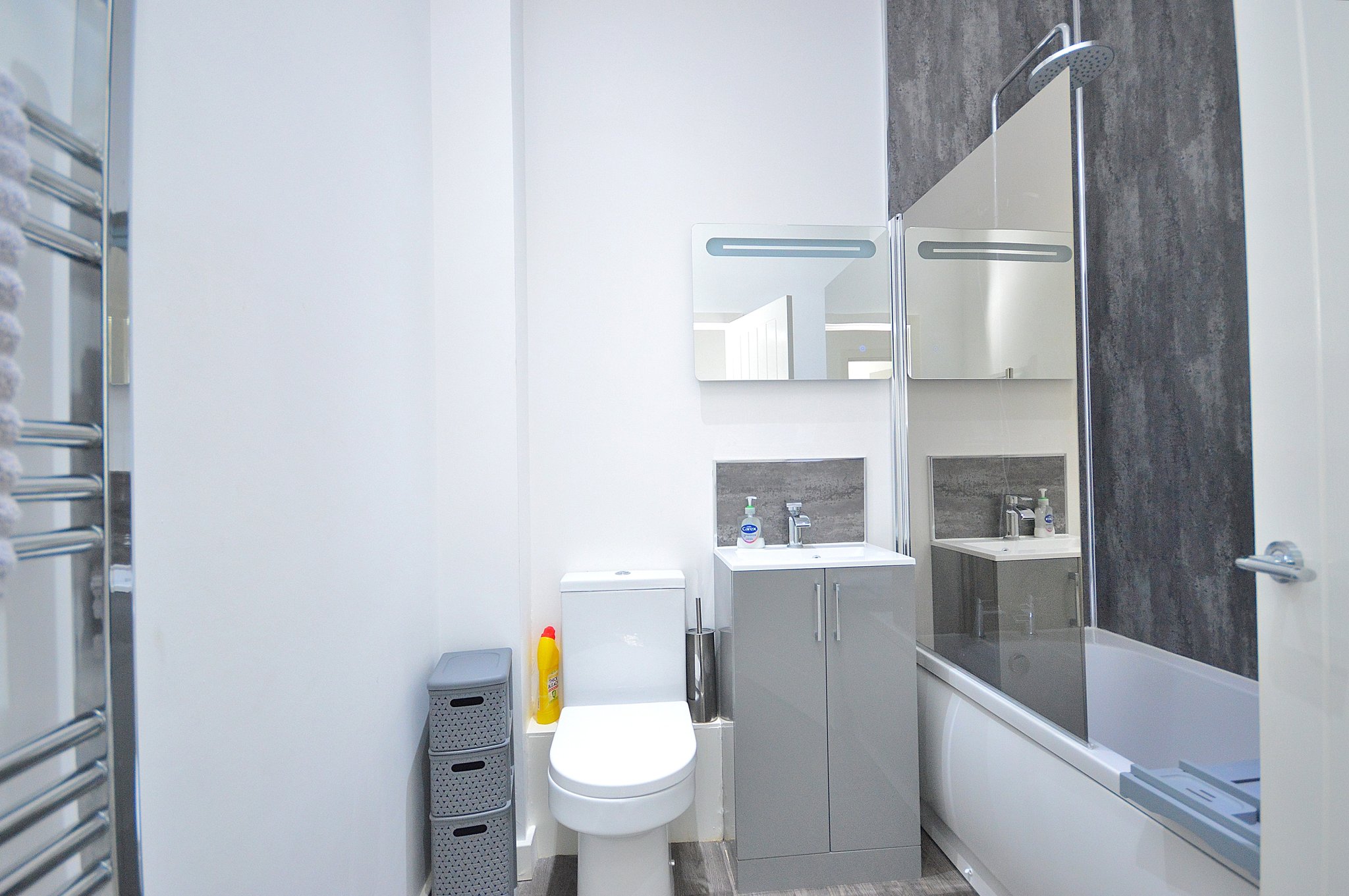 Fitted three piece suite comprising of a low level Wc, vanity unit with wash hand basin and a panelled bath with shower and bath screen. Heated chrome towel rail.