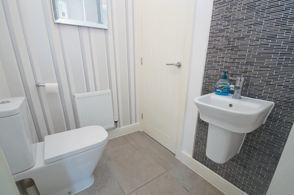 GUEST WC Tiled flooring. Low flush WC. Wall mounted wash hand basin. Tiling to splashbacks. Door to under-stairs storage cupboard. Extractor fan. Wall mounted radiator.