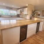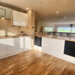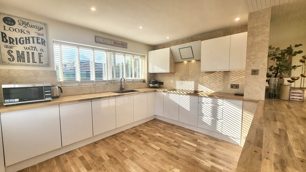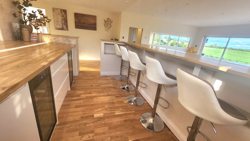 The property welcomes you via a charming porch, leading into an open-plan hall that immediately sets a warm, inviting tone. At the heart of the home, the spacious breakfast kitchen is fitted with modern cabinetry, oak block work surfaces, integrated appliances, and a breakfast bar-ideal for family life and entertaining.