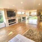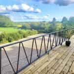 The open-plan sitting room is a highlight, featuring a cosy open fire, wall-mounted TV, and wide patio doors opening onto a timber balcony with wrought-iron railings, offering breathtaking panoramic views over the surrounding countryside. Adjacent, a formal dining room provides the perfect space for hosting family and friends.
