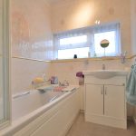 Two piece suite comprising: Vanity unit with sink mounted over. Panelled bath with shower over. Obscured double glazed window to the front aspect. Radiator. Coving.