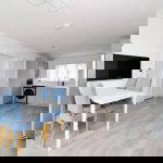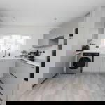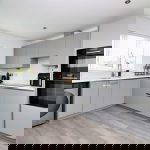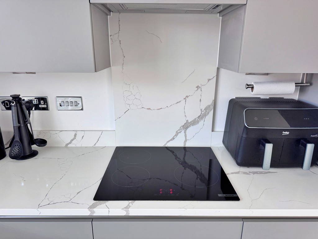 The heart of the home is the impressive open-plan kitchen/dining room, fitted with stylish grey matt units and quartz worktops, complemented by a range of integrated Bosch appliances including a high-level oven, microwave/grill, induction hob, dishwasher and fridge/freezer. The space is enhanced by Karndean flooring, spotlights, undercounter lighting and dual aspect windows, with French doors opening onto the south-facing rear garden, allowing plenty of natural light and taking full advantage of the countryside views.