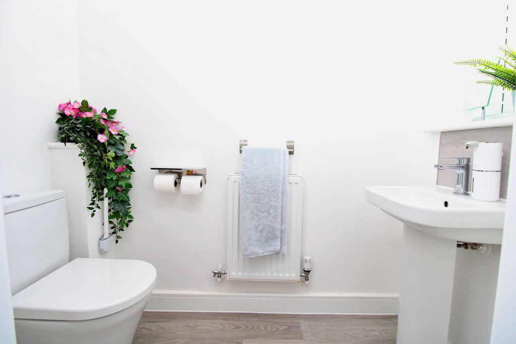 The ground floor is completed by a welcoming entrance hall and a guest cloakroom, both finished with Karndean flooring, along with a fob-controlled alarm system.