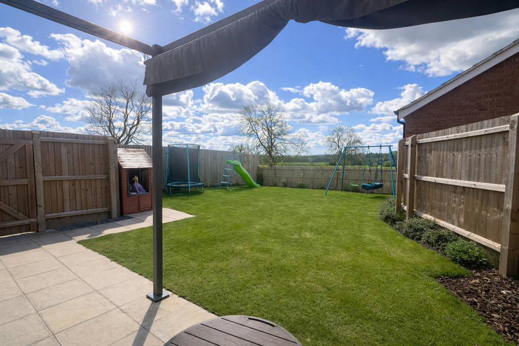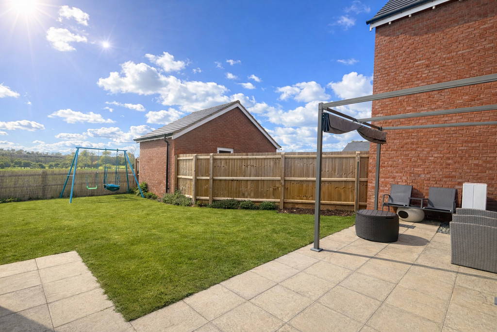 Outside, the property boasts a generous south-facing rear garden, offering a high degree of privacy with a lawn and patio area ideal for entertaining. A lower rear boundary fence has been designed to maximise the open field views. Additional benefits include external power sockets, lighting and a water tap.