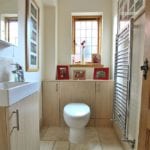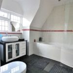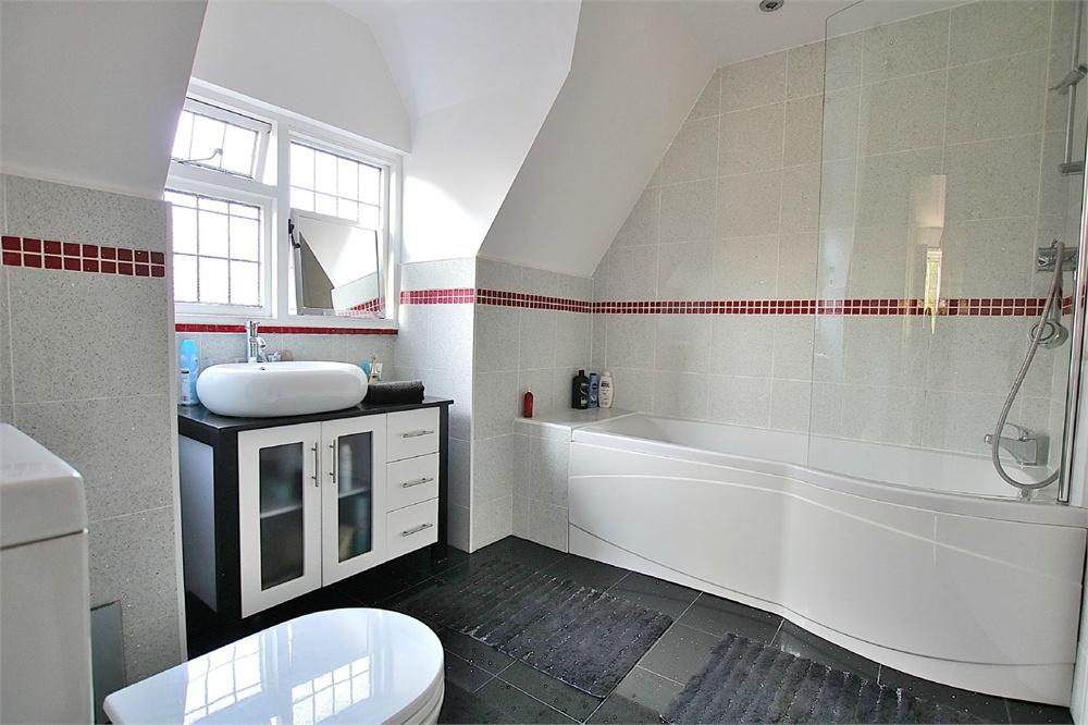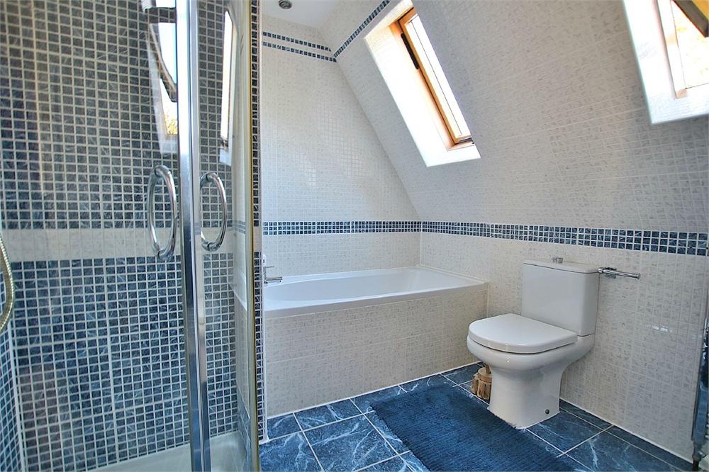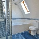 9' 2" x 7' 8" (2.79m x 2.34m) Comprising panelled bath, separate shower cubicle, wash hand basin and low level w.c. Tiled floor and walls. Towel rail. Two double glazed velux windows.