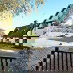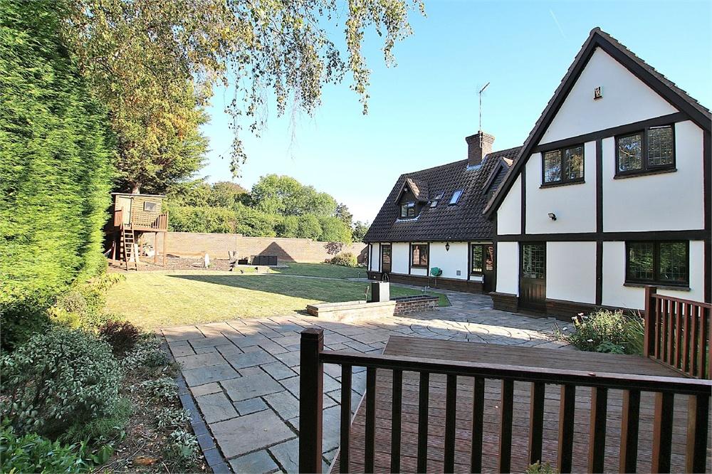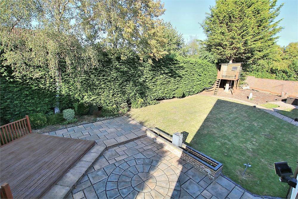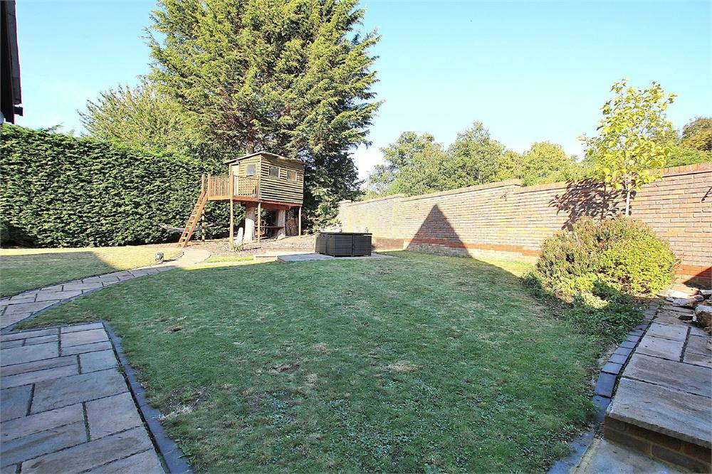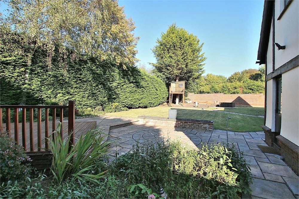 Enclosed garden with patio areas leading on to lawn. Timber decking area. Tree house and shed.