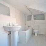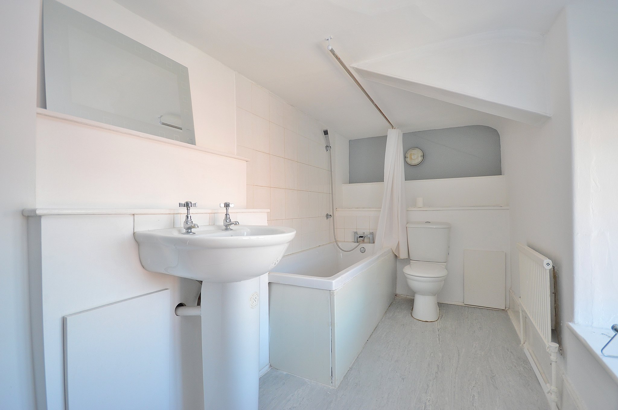 Three piece suite comprising: Low flush Wc. Pedestal wash hand basin. Panelled bath with shower over. Radiator. Window to the side aspect.