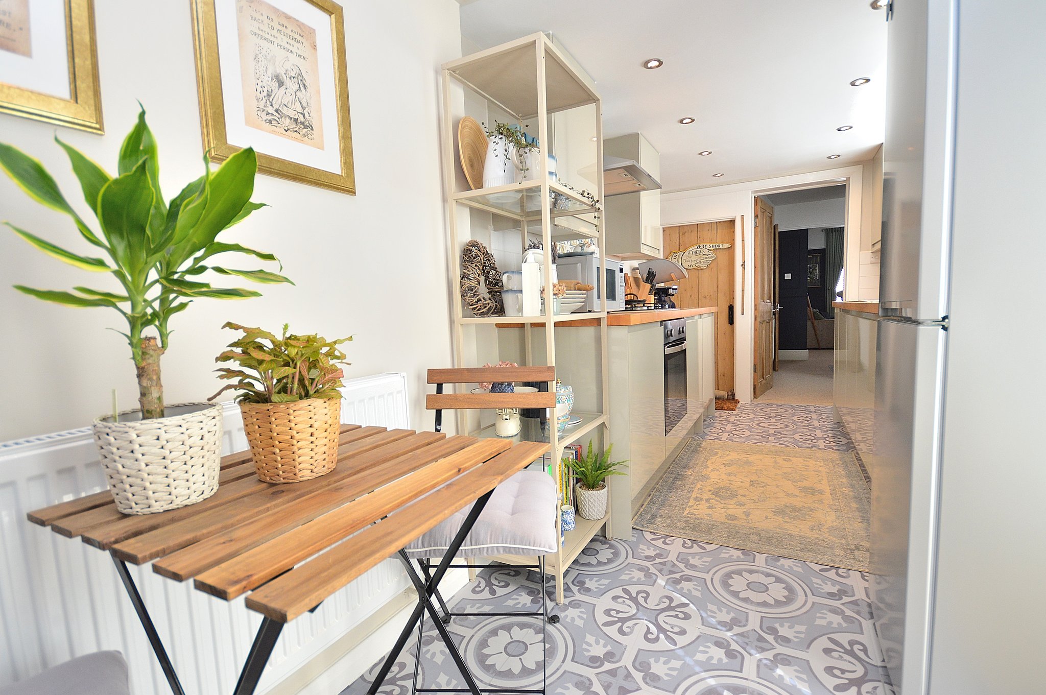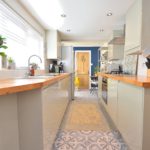 17' 4" x 6' 9" MAX (5.28m x 2.06m) Modern fitted kitchen suite comprising of a range of base and eye level units with contrasting work surface mounted over. Inset one and a half bowl and drainer unit with mixer tap over. Fitted electric oven. Fitted gas hob with extractor hood mounted over. Integrated dishwasher. Space for fridge/freezer. Radiator. Double glazed French doors to rear aspect. Double glazed window to the rear aspect.