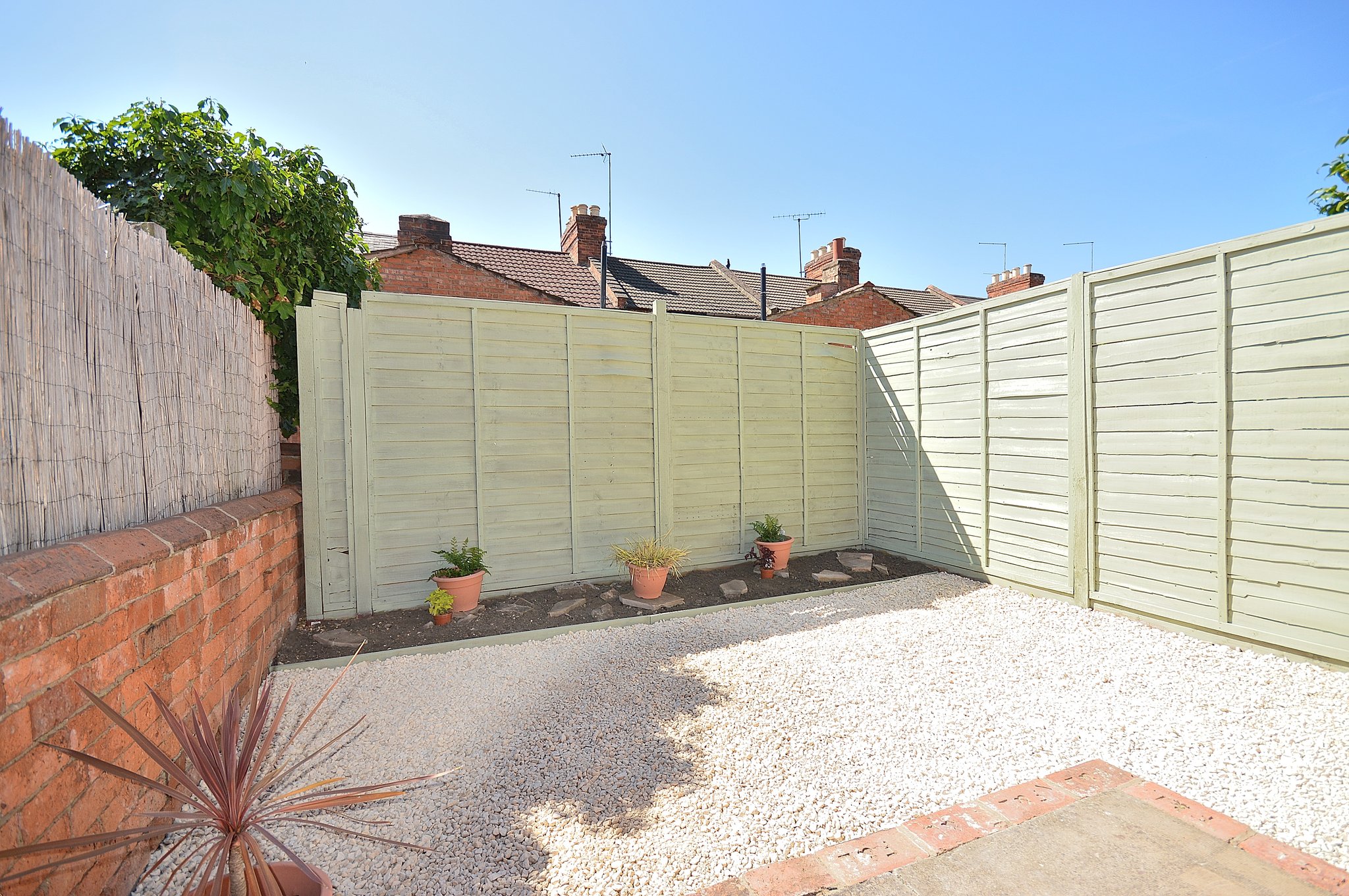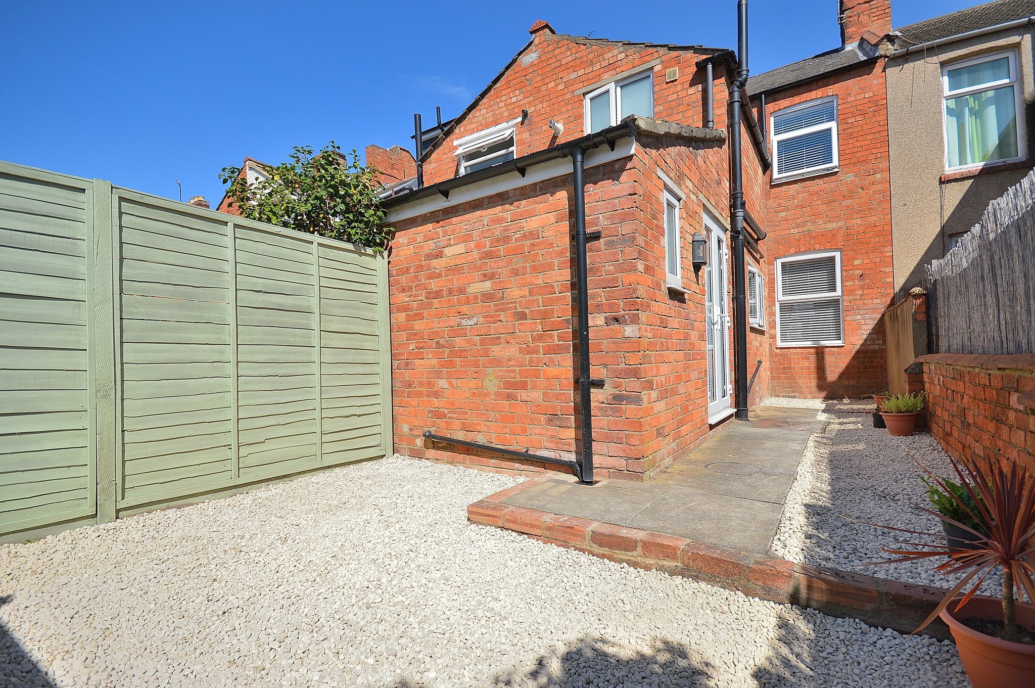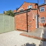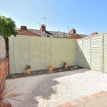 Enclosed rear garden mostly laid to gravel with a pathway and flower bed to the rear.