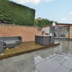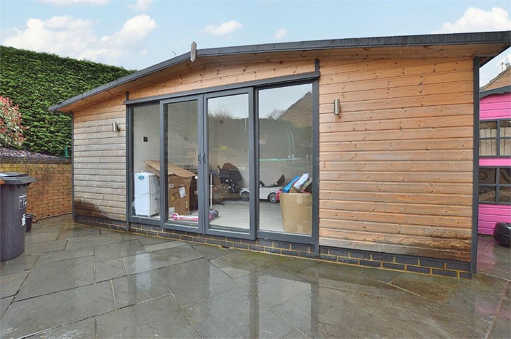 Patio area with steps up to a lawn with raised shrub borders. Decked area. Side pedestrian gate. Outdoor cabin with double glazed French doors. Power and light connected and Sky TV connection.