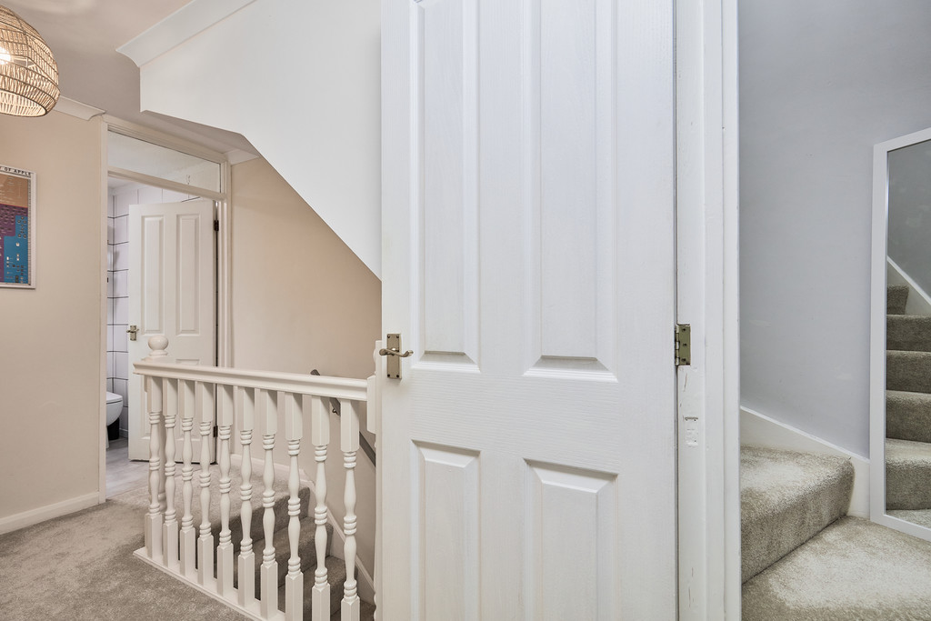 The first floor offers two well-proportioned double bedrooms, served by a modern family bathroom. The second floor has been converted to create a stunning master suite, featuring a large double bedroom with built-in storage and an en-suite shower room - a perfect private retreat.