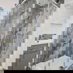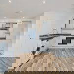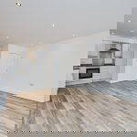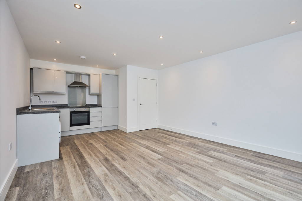 OPEN PLAN LIVING KITCHEN DINER 20' 8" x 13' 2" max (6.3m x 4.01m) uPVC double glazed French doors to a Juliet balcony. Double panel radiator with thermostat control. TV and telephone sockets. A range of grey gloss eye and base level units surmounted by marble effect worktops. Inset stainless steel 1.5 bowl sink and drainer with mixer tap over. Built-in stainless steel single electric oven, black ceramic hob and chimney extractor hood. Integrated fridge freezer. Washing machine. Wood effect flooring. Recessed ceiling spotlights. Ceiling mounted heat sensor.